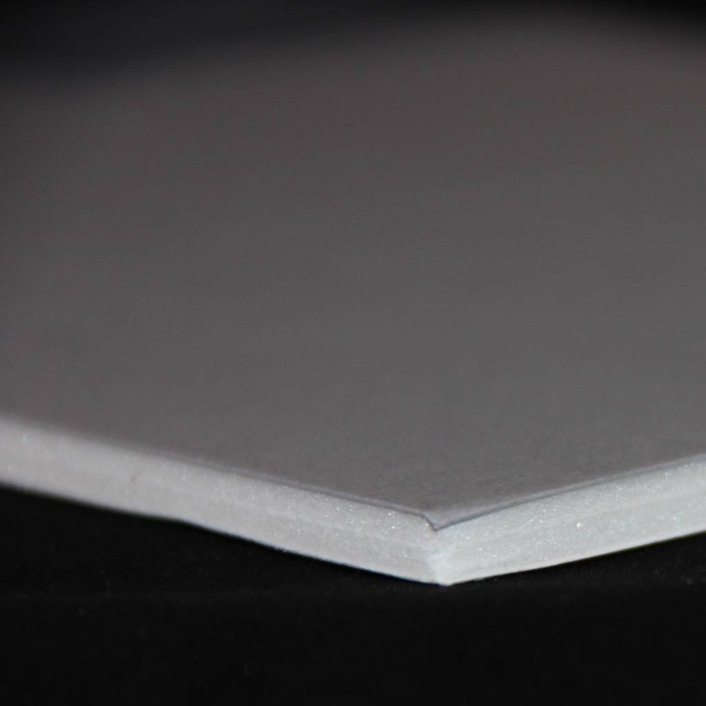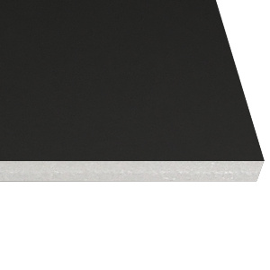 Den har en vit kärna med en svart sida och en grå sida, vilket gör den flexibel för olika grafiska och estetiska användningsområden. Skivan är lätt att skära och arbeta med, utan att smulas sönder, vilket gör den perfekt för fotomontage, utställningspaneler och inredningsapplikationer.